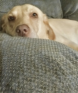 Sophie loves to lie on the couch next to me! Here’s a photo of her resting her chin on the arm like Shadow.